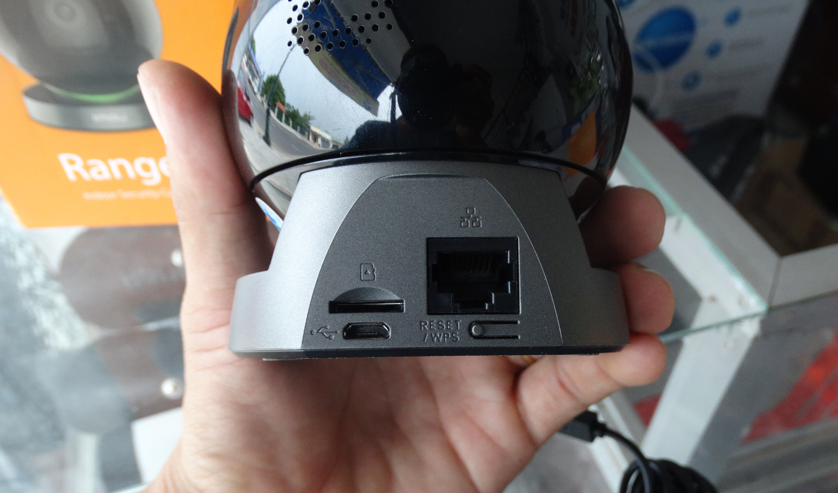 Mặt sau chúng ta có khe thẻ nhớ microSD, cổng cắm microUSB để cấp nguồn cho camera và nút reset/WPS giúp setup nhanh mạng không dây hoặc reset thiết bị. Ngoài ra, trên chiếc Imou này còn có một cổng LAN rất hữu dụng nếu bạn muốn kết nết có dây để ổn định hơn.
